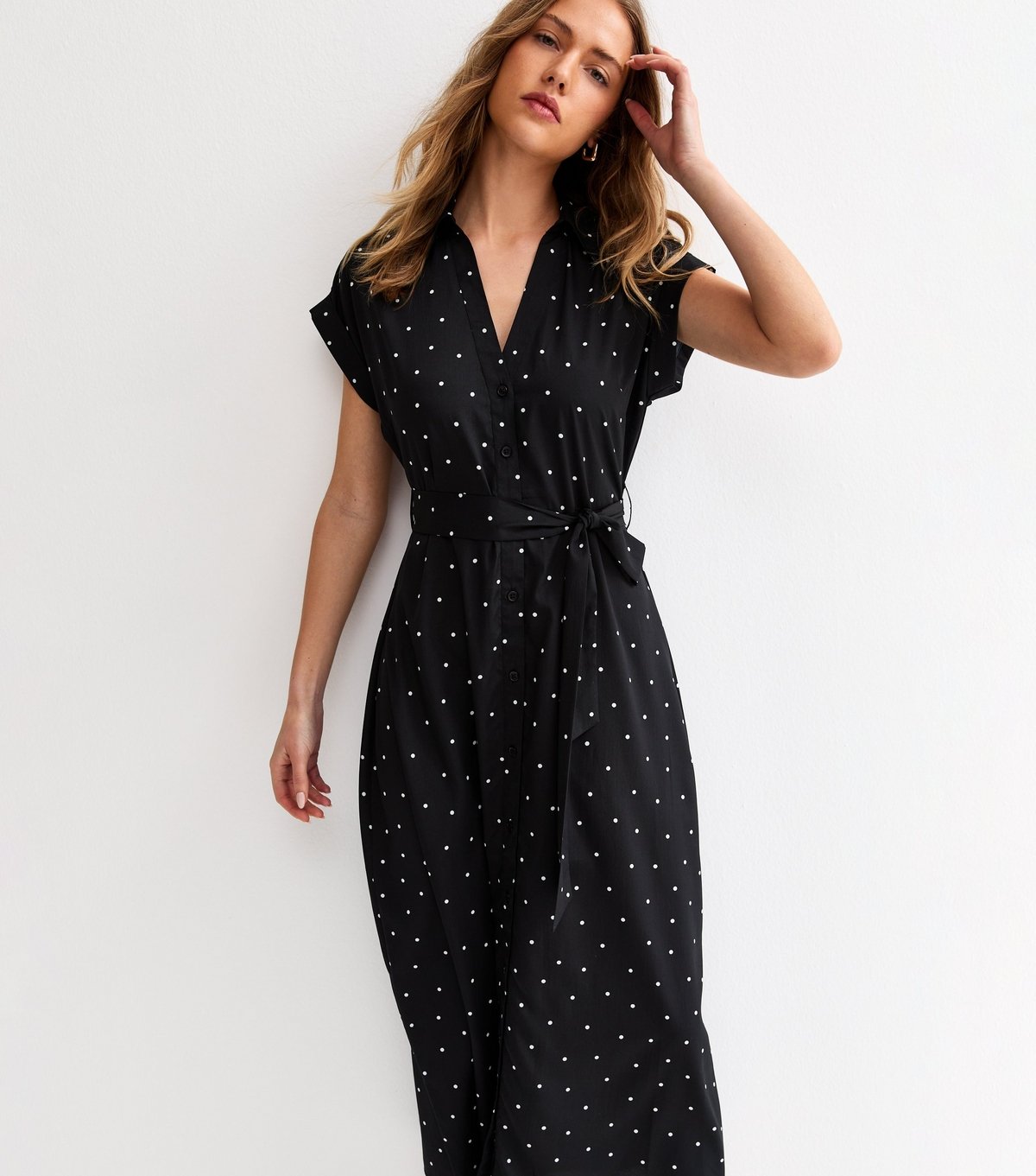 Playful and classic, this black dot print midi dress features a collared neckline and a sash tie belt. Ideal for workwear or weekend looks.
