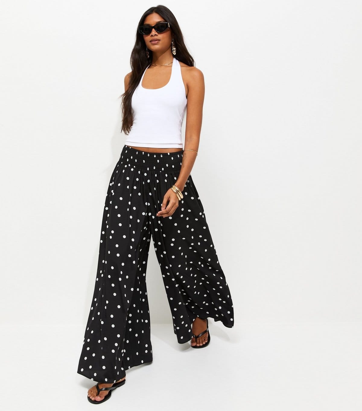 View New Look UK's returns policyPlayful black spot print crepe palazzo trousers with a relaxed fit and wide leg design. Perfect for creating fun, proportion-playing looks.