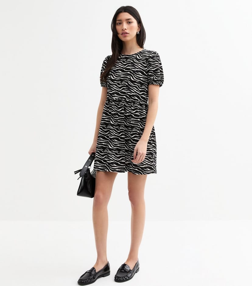 The New Look Black Zebra Print Mini Smock Dress is available in sizes 10, 6.