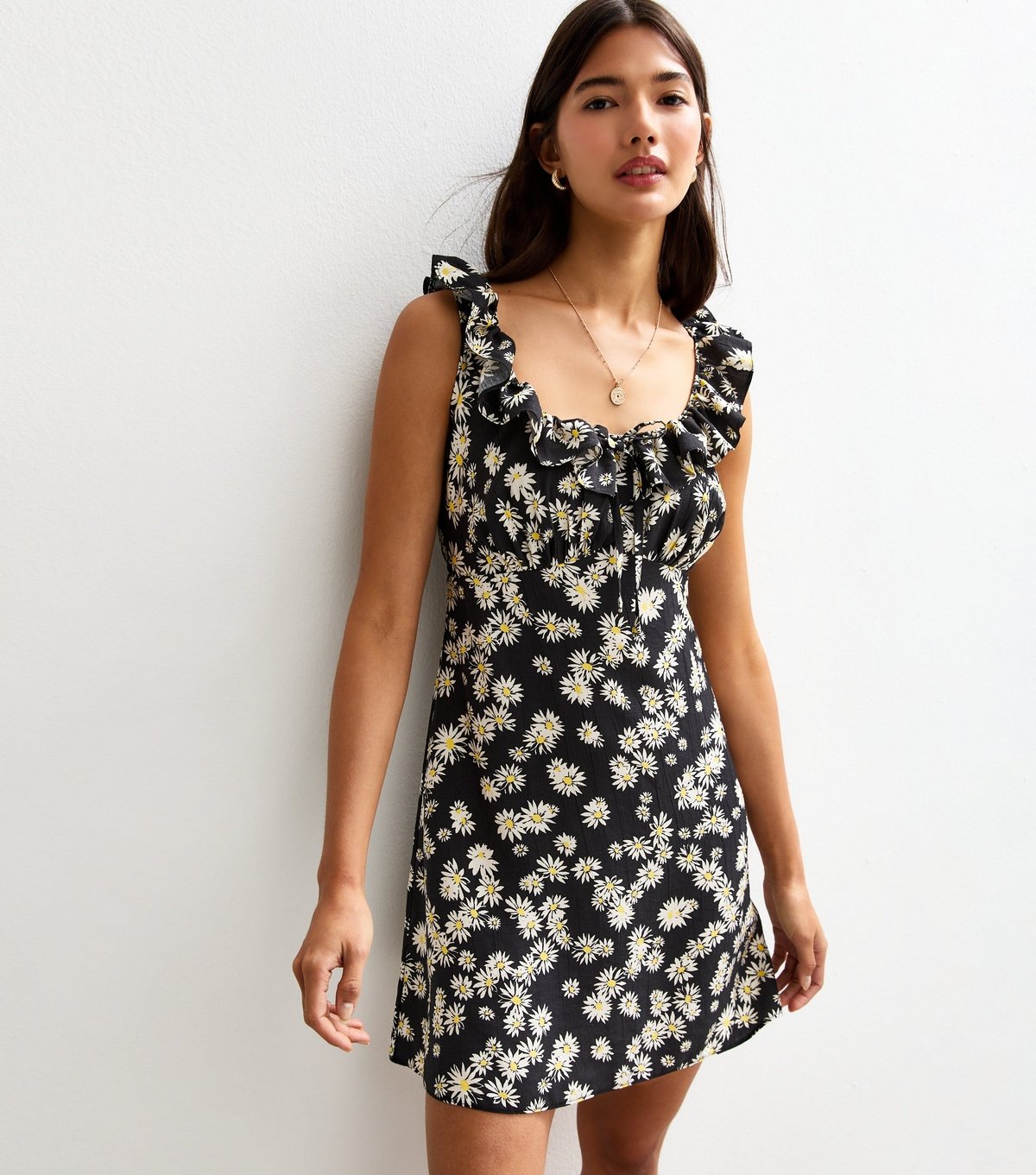 The New Look Black Daisy Print Sweetheart Tie Back Mini Dress is available in sizes 18.
