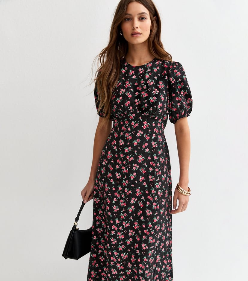 The New Look Black Floral A-line Midi Dress is available in sizes 10, 12, 14, 16, 18, 20, 22.
