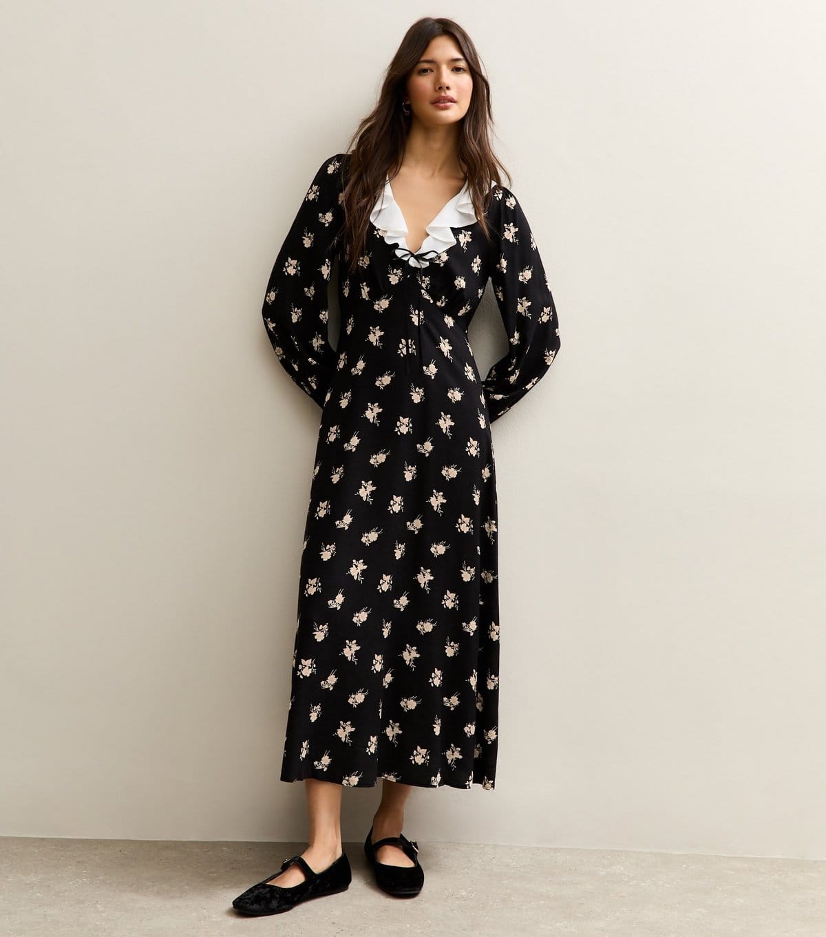 The New Look Black Floral Frill Collar Midi Dress is available in sizes 6, 8.