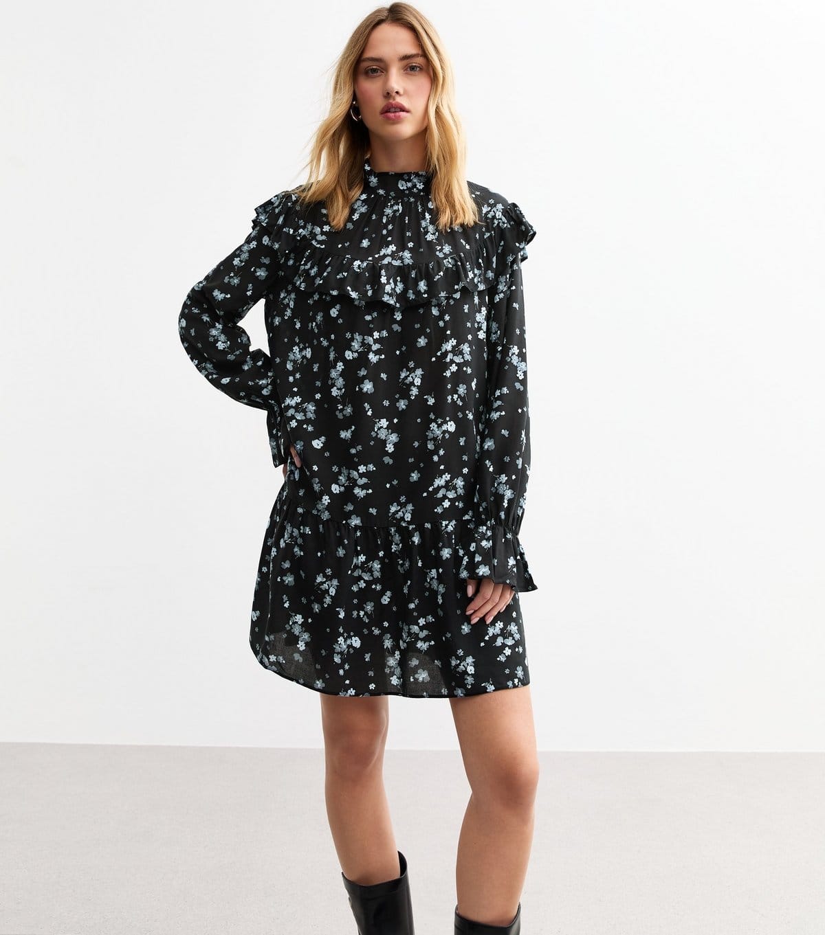 View New Look UK's returns policyThis black floral-print mini dress features a high neckline and a relaxed fit. The dress has a tiered hem and ties at the back of the neck. Perfect for casual outings or evening events.