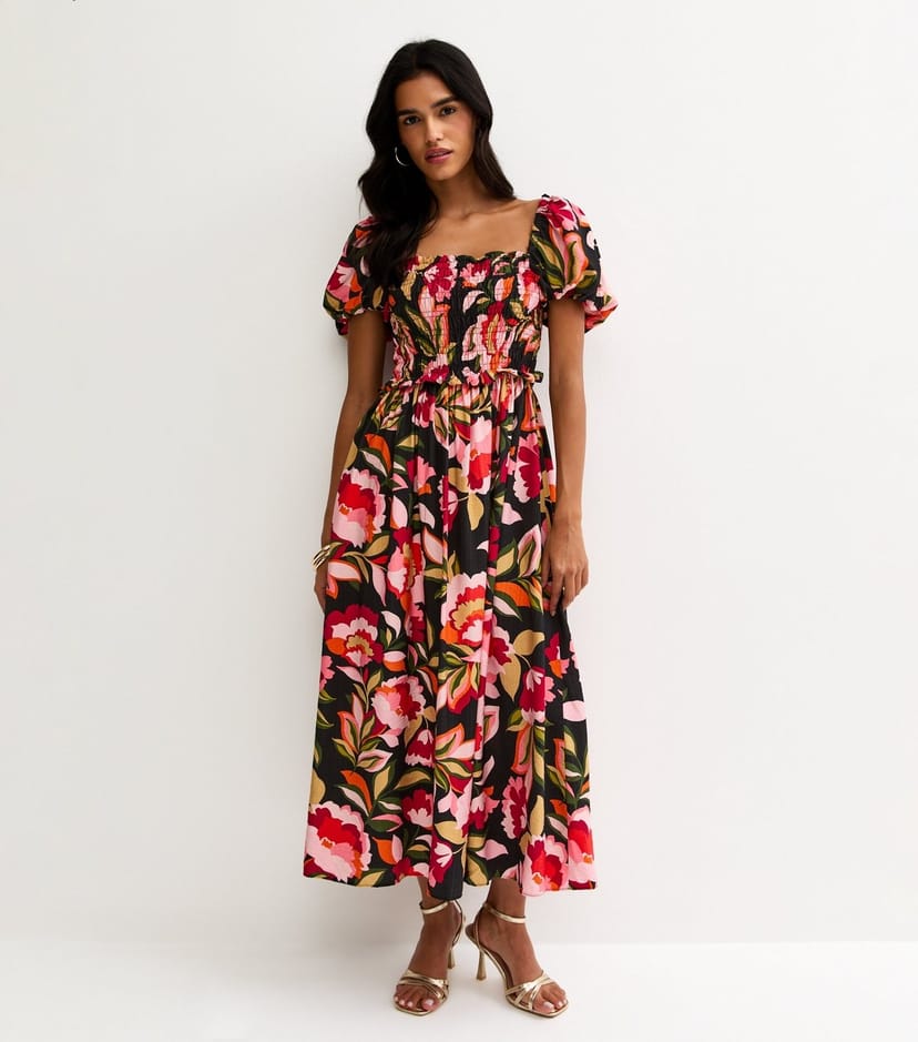 The New Look Black Floral Print Shirred Midi Dress is available in sizes 10, 12, 14, 16, 18, 20, 22, 6, 8.