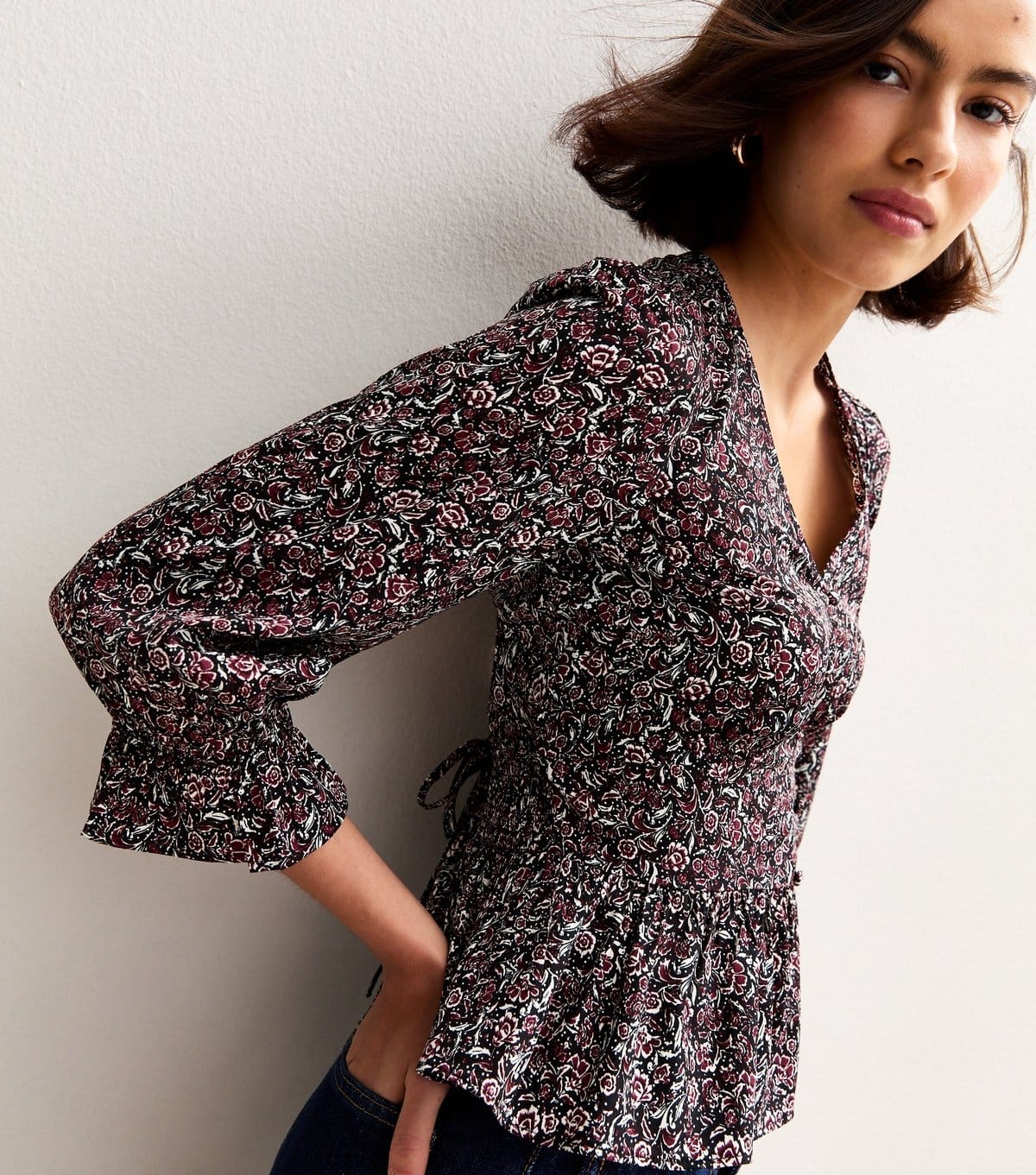 This black floral print blouse features a flattering V-neckline and long sleeves. The peplum hem adds a feminine touch, making it perfect for casual weekends.