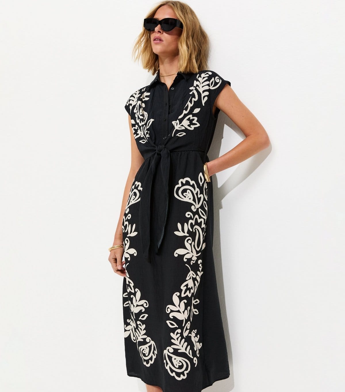 Stylish black midi dress with a folk paisley pattern and a flattering waist tie design. Perfect for summer daytime events.