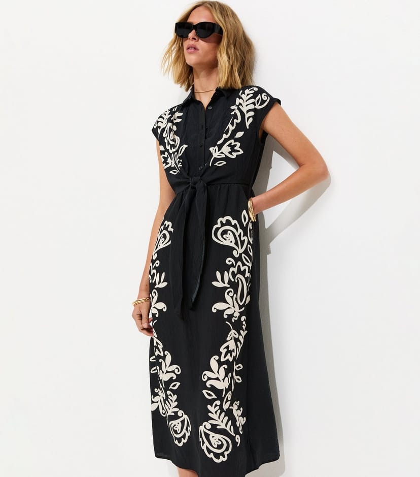 The New Look Black Folk Paisley Shirt Midi Dress is available in sizes 10, 12, 14, 16, 18, 20, 6, 8.