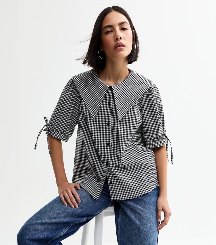 The New Look Black Gingham Oversized Collar Top is available in sizes 6.