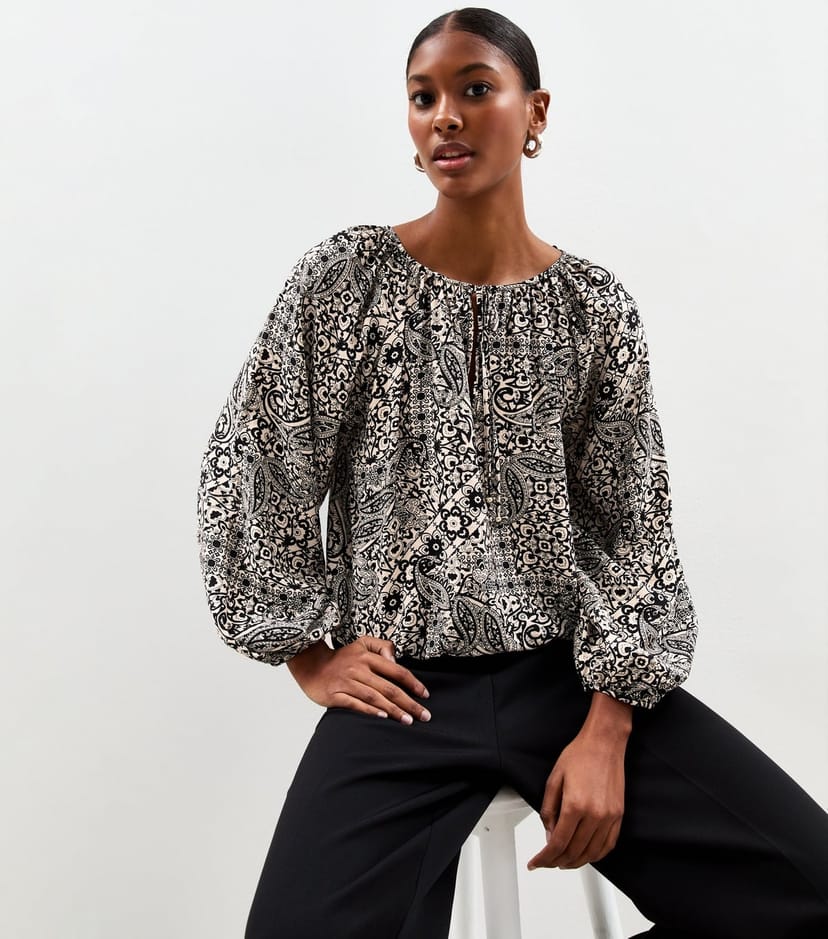 The New Look Black Paisley Print Tie Neck Blouse is available in sizes 6.