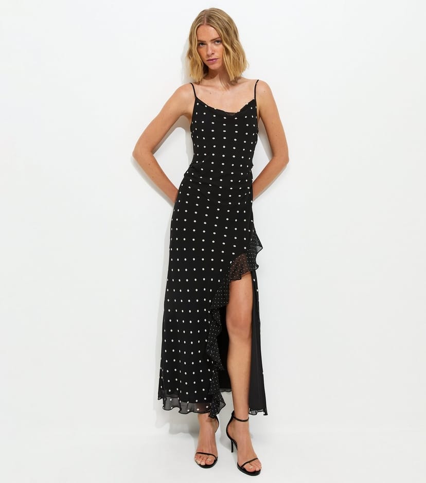 This black midi dress by New Look features a polka dot print and a cowl neckline. Made from lightweight chiffon, it offers a flowy silhouette with a ruffled side split for added flair. Ideal for evening events or casual outings.