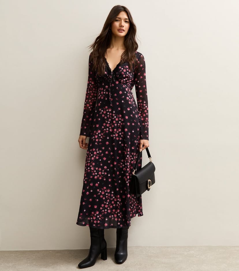 The New Look Black Floral Mesh Long Sleeve Midi Dress is ideal for evening, date-night, party.