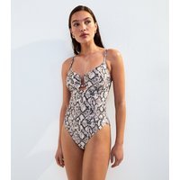 The New Look Black Snake Print U Bar Swimsuit is available in sizes 8.