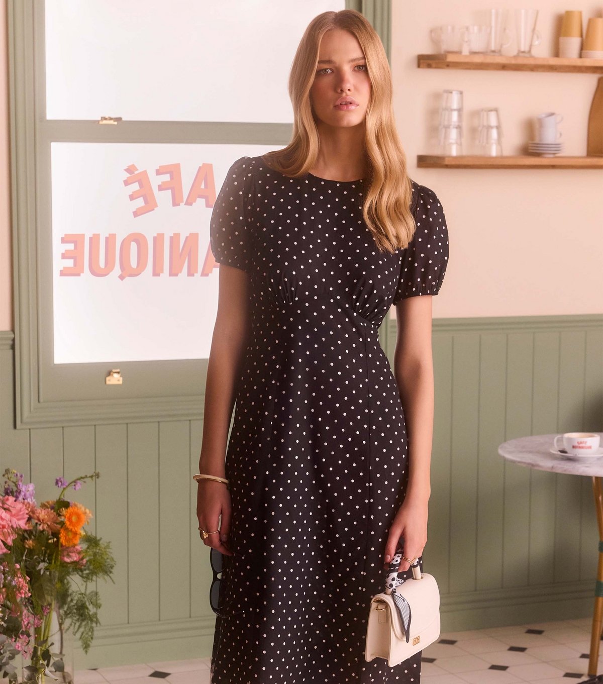 The New Look Black Spot Print Lace Trim Midi Dress is available in sizes 10, 12, 14, 16, 18, 20, 6, 8.