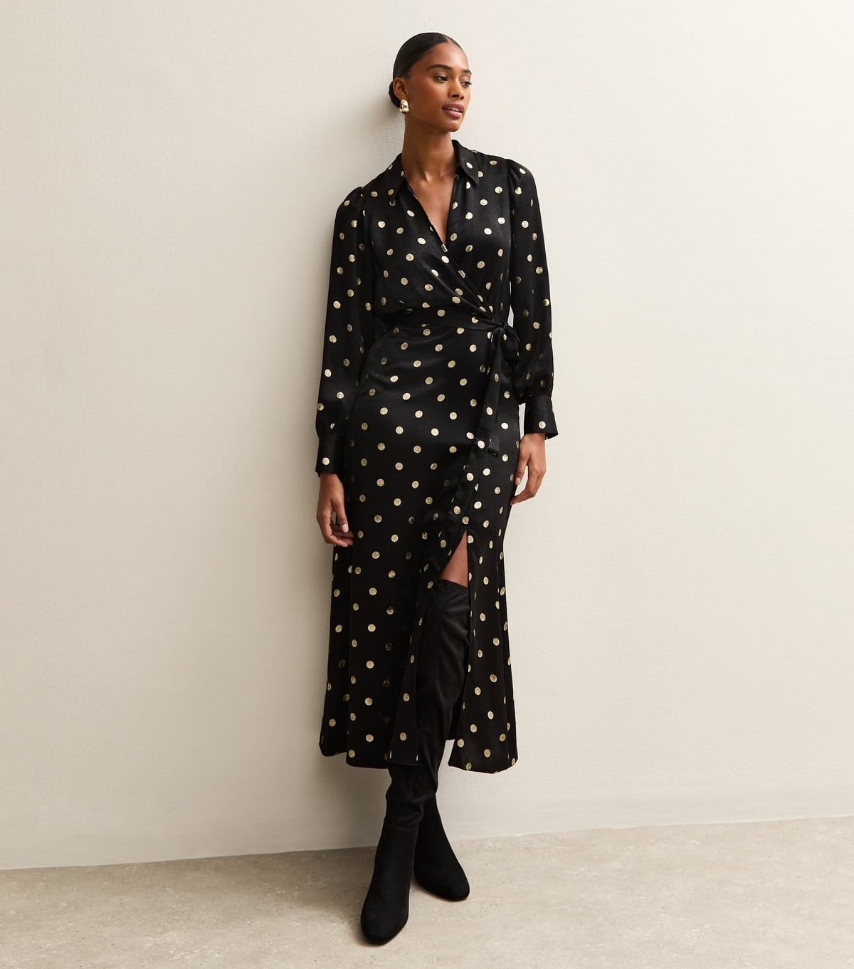 The New Look Black Spot Print Satin Wrap Midi Dress is made from satin.