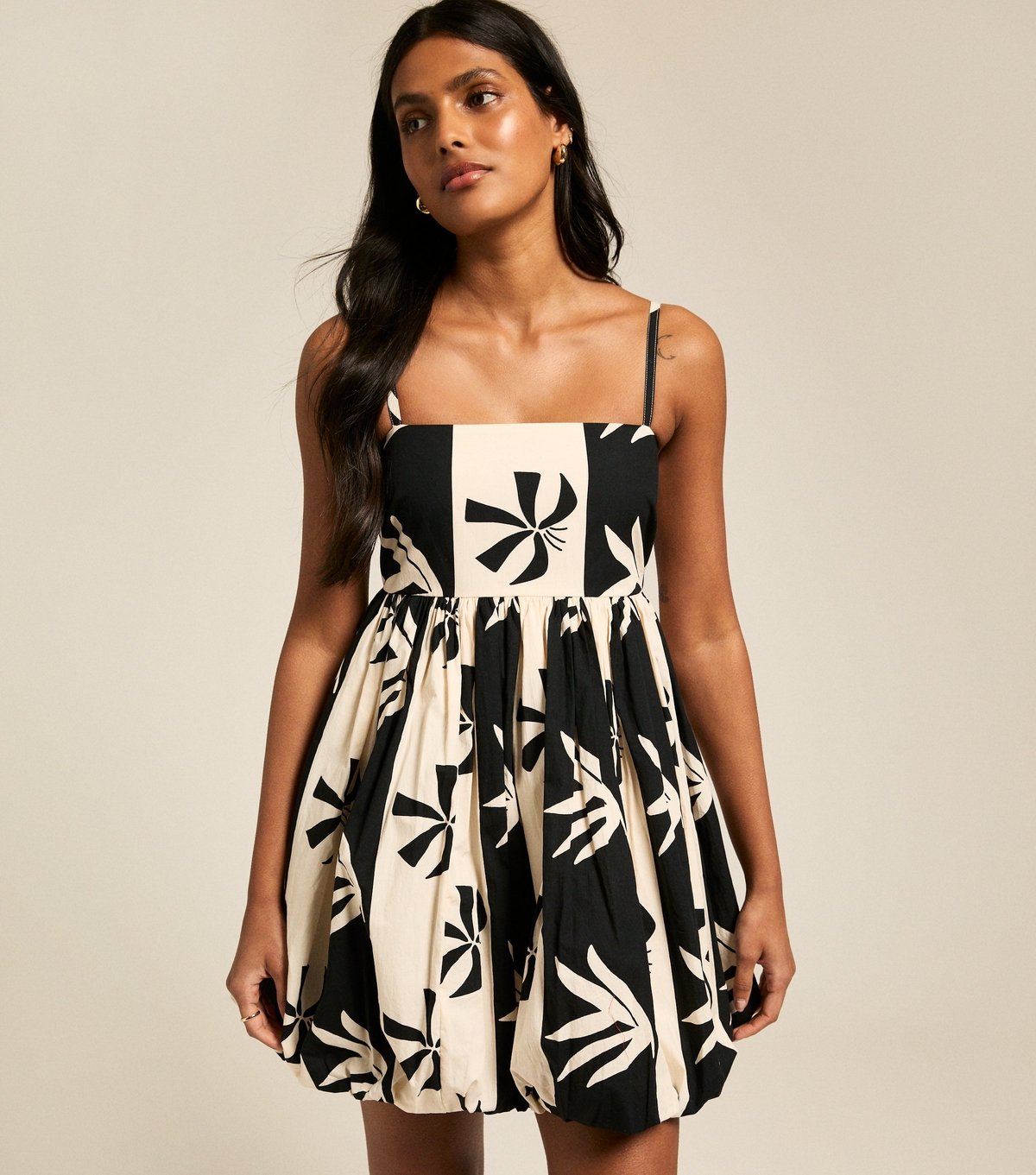 This black and cream mini dress by New Look features a slim bodice and a full gathered skirt with a puffball hem. The striped and floral print adds a touch of summer flair.