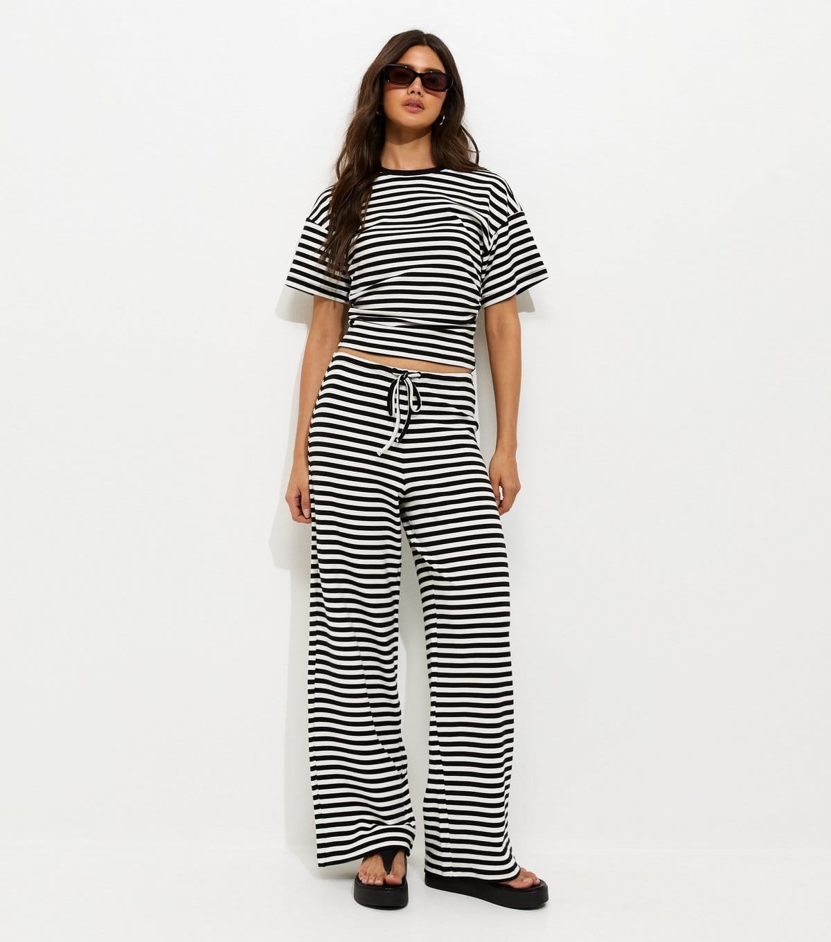 Effortless casual style with these black and white striped wide leg trousers. Made from jersey fabric, these trousers offer a relaxed fit and full length for versatile wear. Perfect for pairing with the coordinating crop top for a cohesive look.