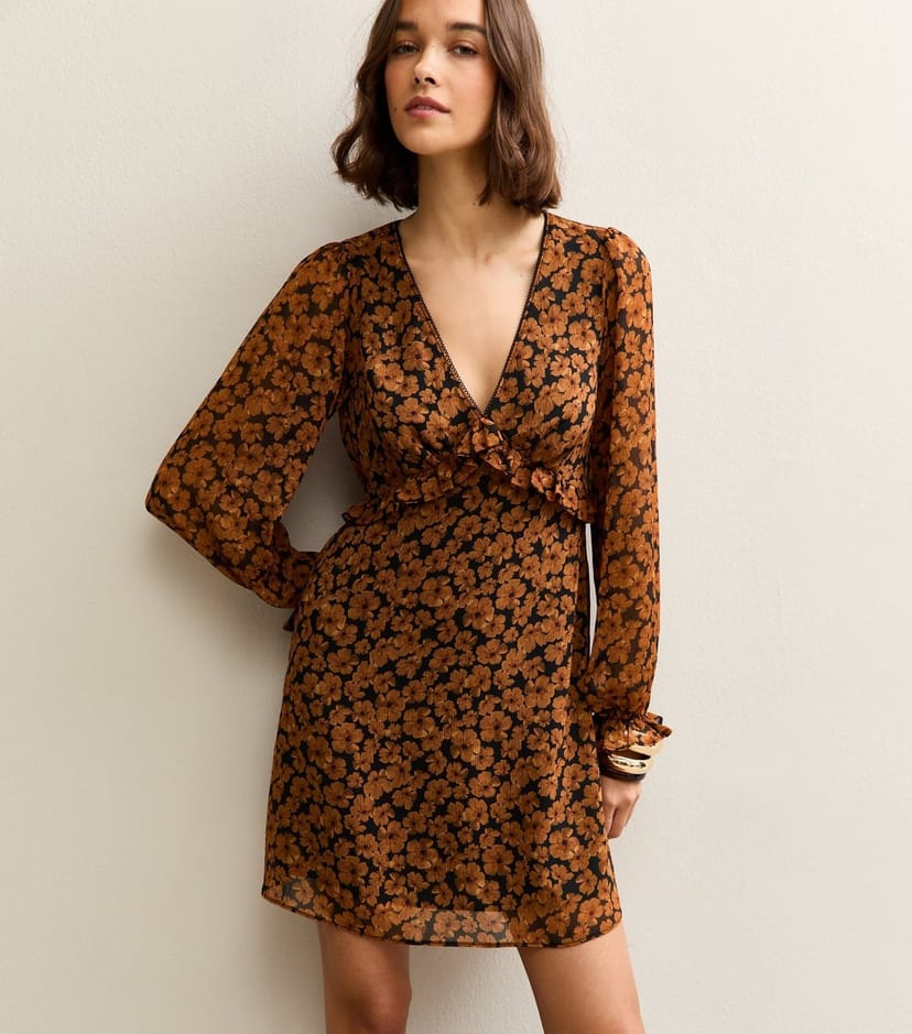 The New Look Brown Floral Long Sleeve Mini Dress is made from chiffon.