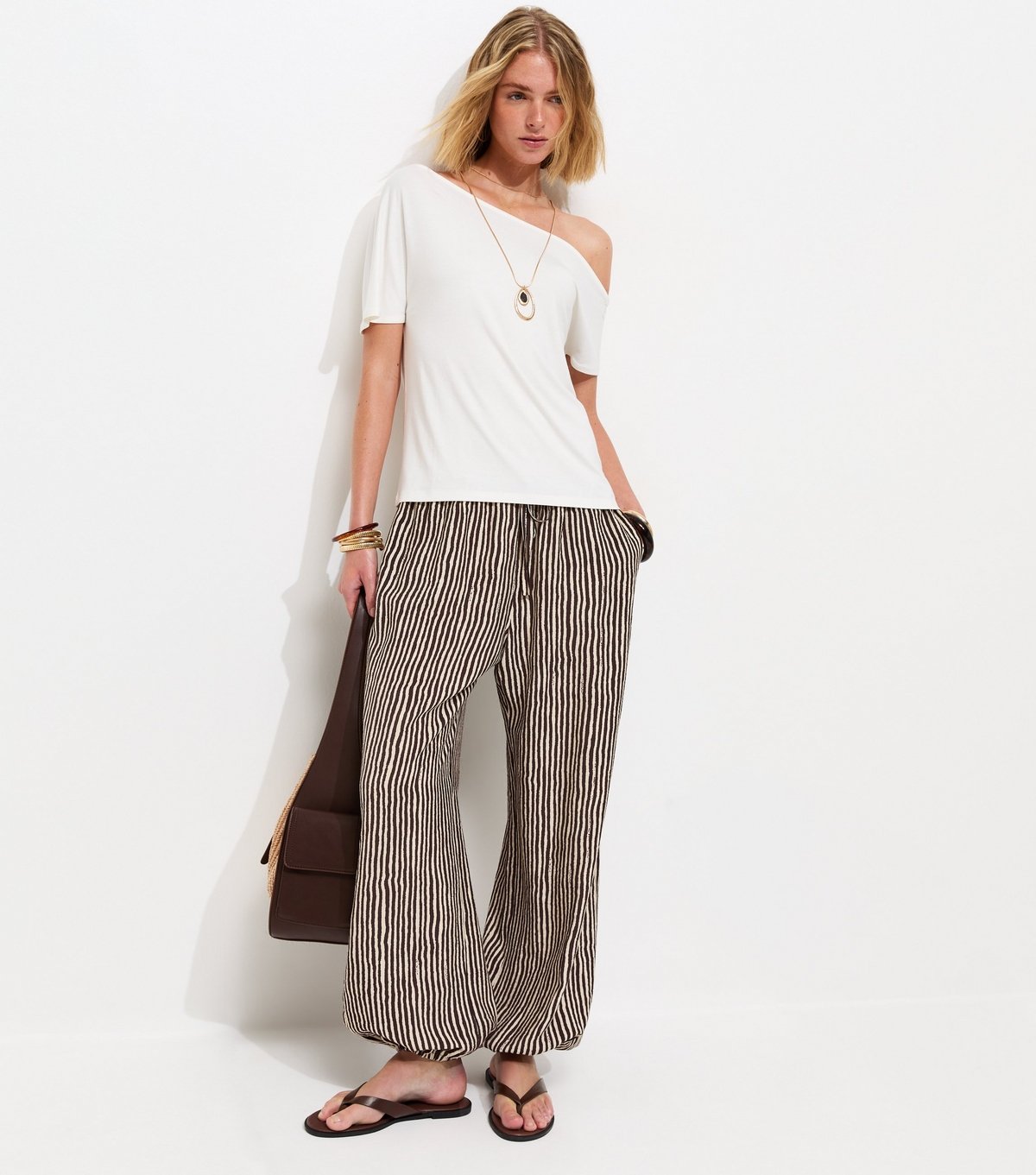 Pair with a white off-shoulder top and brown sandals for a laid-back summer look.