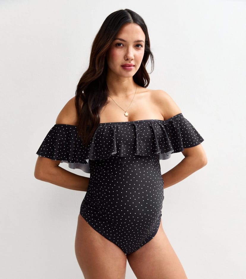 The New Look Black Polka Dot Frilly Trim Maternity Swimsuit is made from jersey.