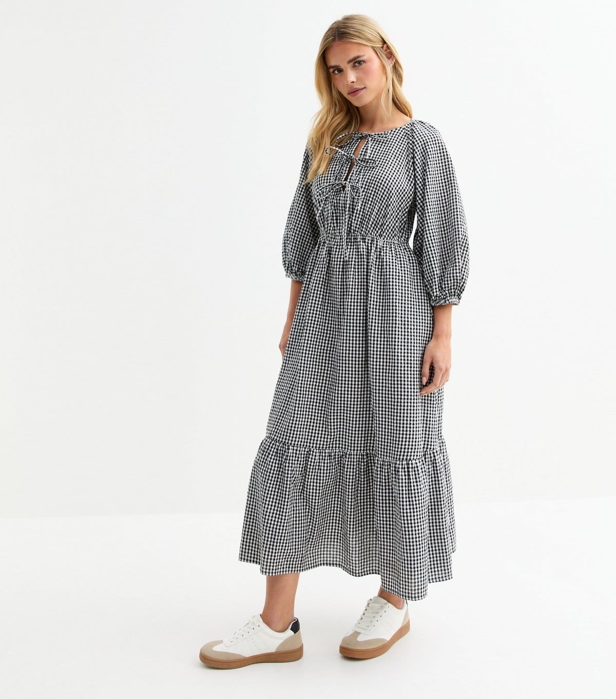 This black and white checked midi dress by New Look features a tie front neckline with cut-outs and three-quarter-length sleeves. The relaxed fit and tiered hem add to its casual charm. Perfect for a preppy yet comfortable look.