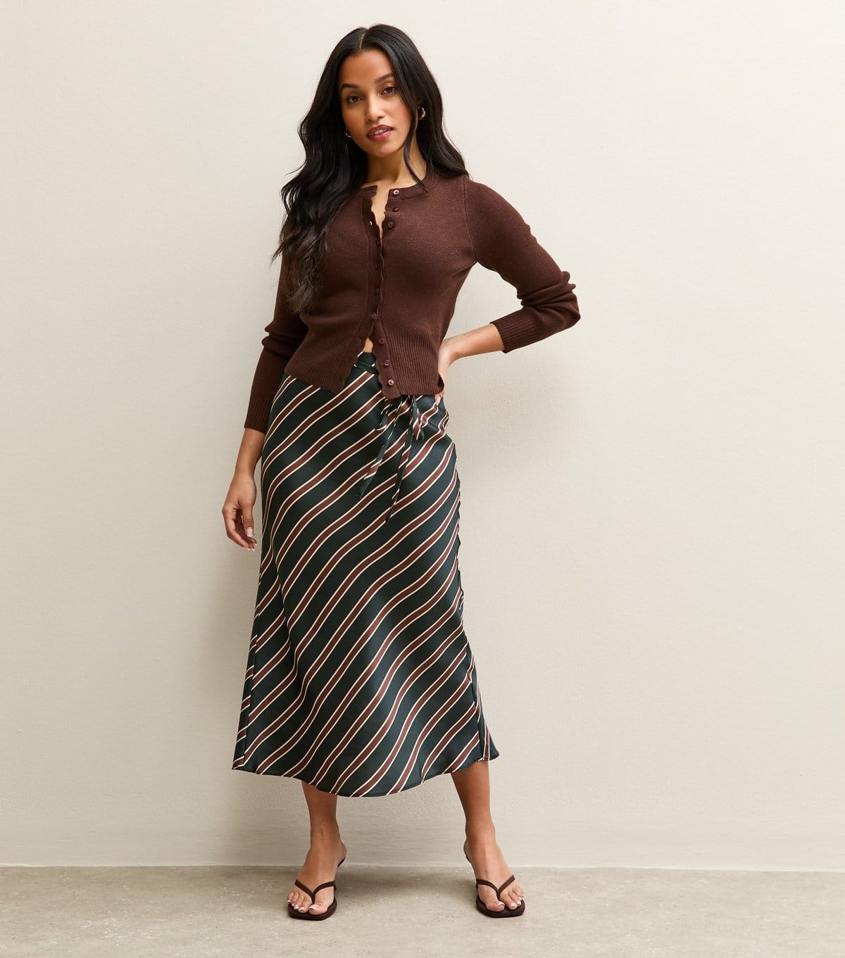 The New Look Black Striped Satin Midi Skirt for Petite Women is ideal for casual, evening, date-night.