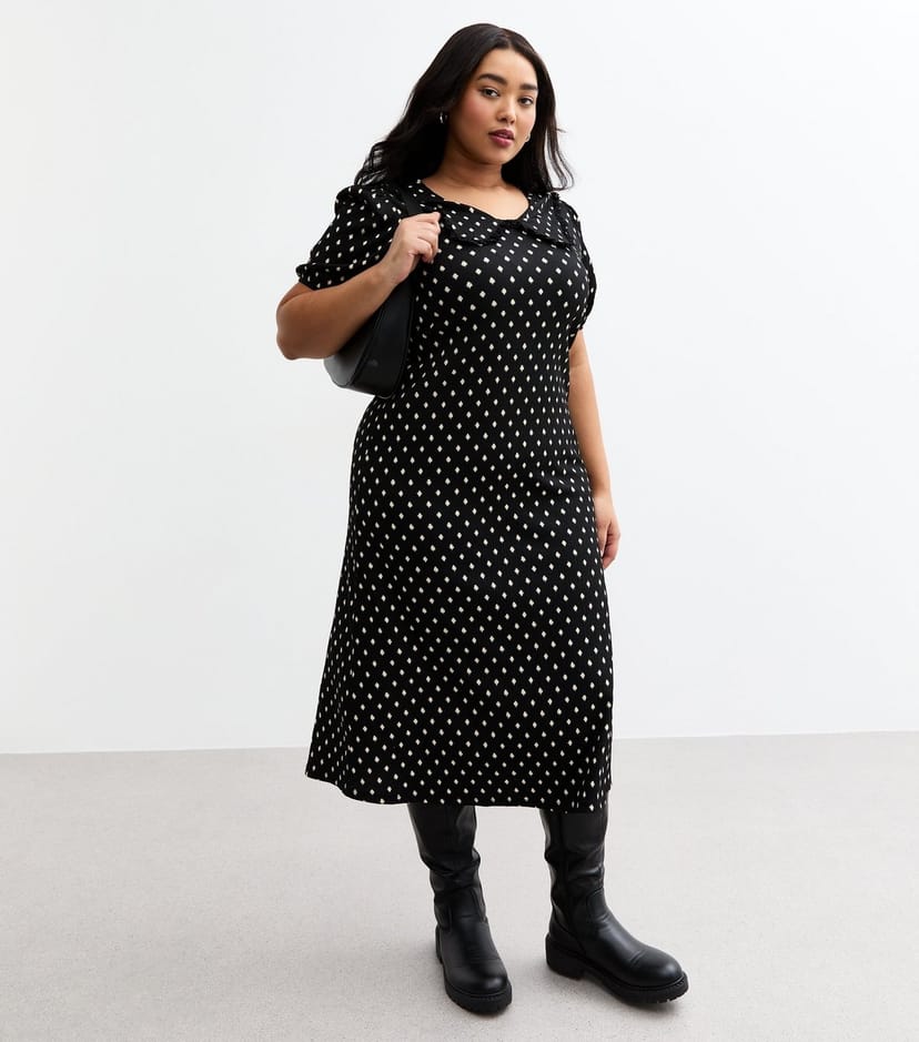 View New Look UK's returns policyThis plus-size midi dress from New Look features a crinkle texture with a spotty pattern in black and white. The lace-trimmed collar and short puff sleeves add a touch of elegance. Ideal for everyday wear, this dress offers a figure-skimming fit and mid-length design.