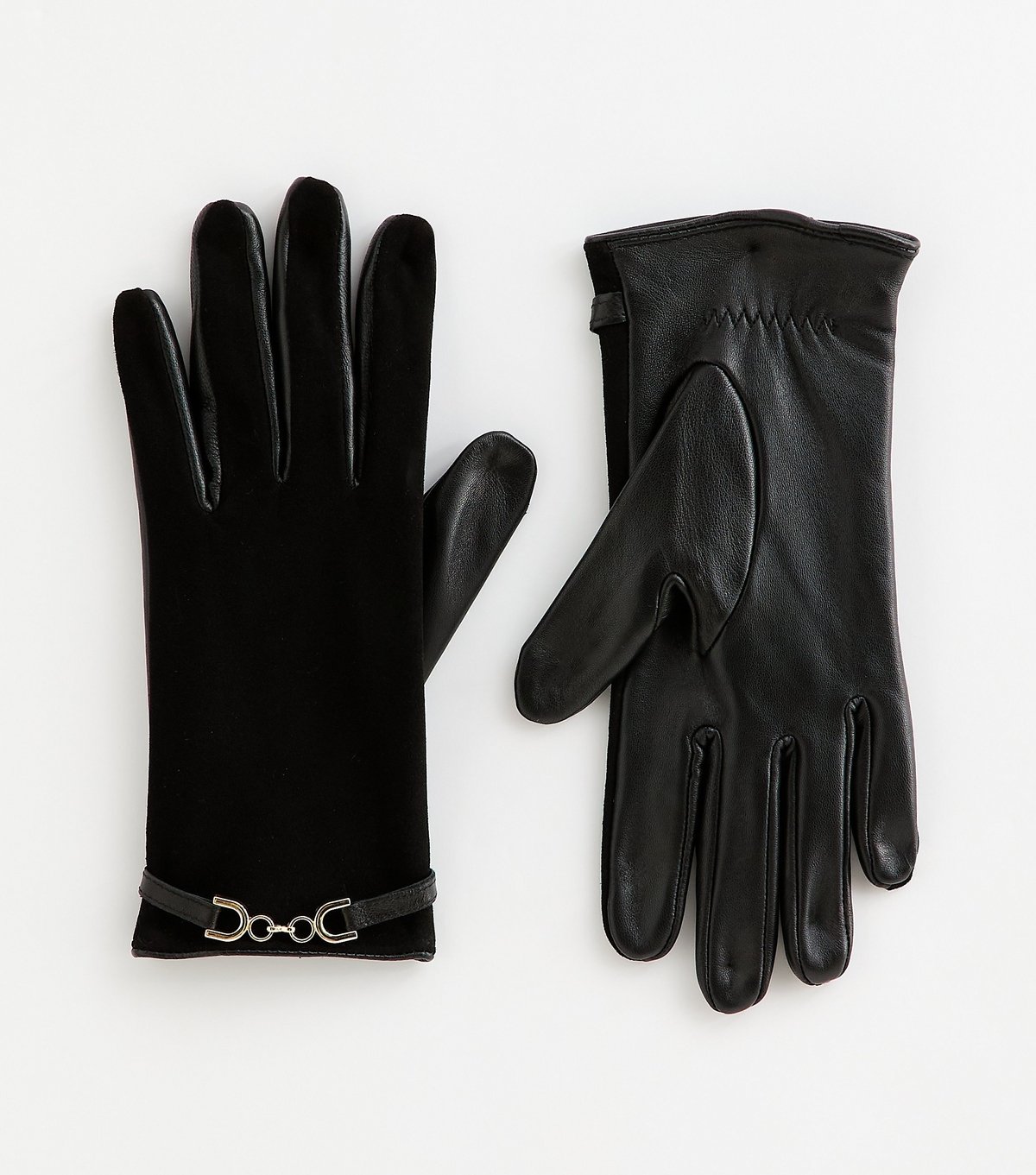 Stylish black leather gloves from New Look featuring a gold-tone buckle strap. Perfect for adding a touch of elegance to any outfit.