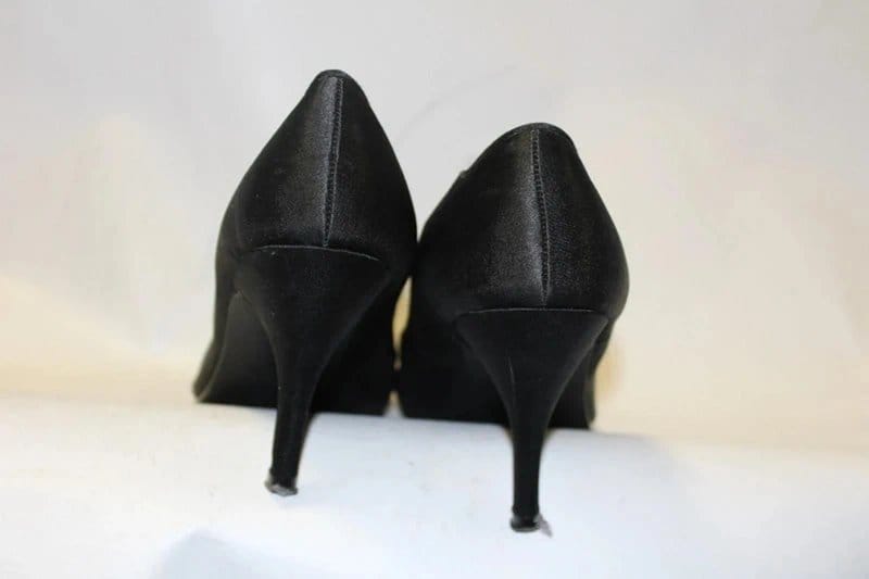 Elegant black satin shoes featuring a striking diamante bow detail. Perfect for evening events or special occasions.