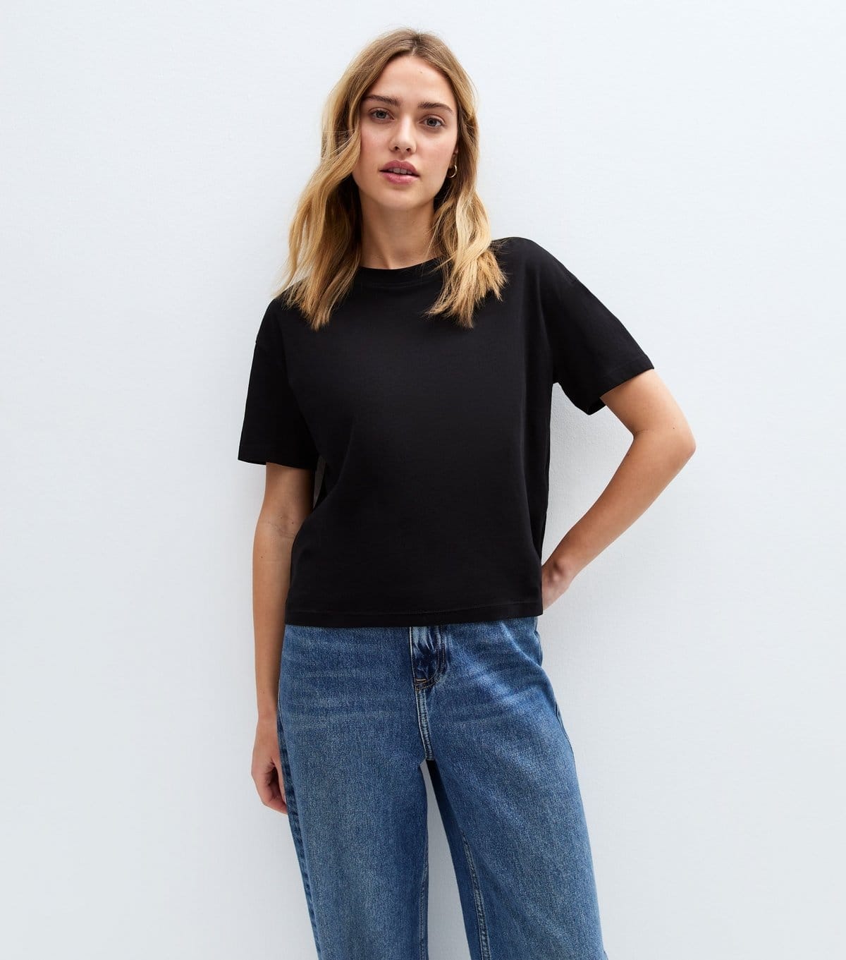 “Pair this black T-shirt with high-waisted jeans and white sneakers for a casual day-out look.”