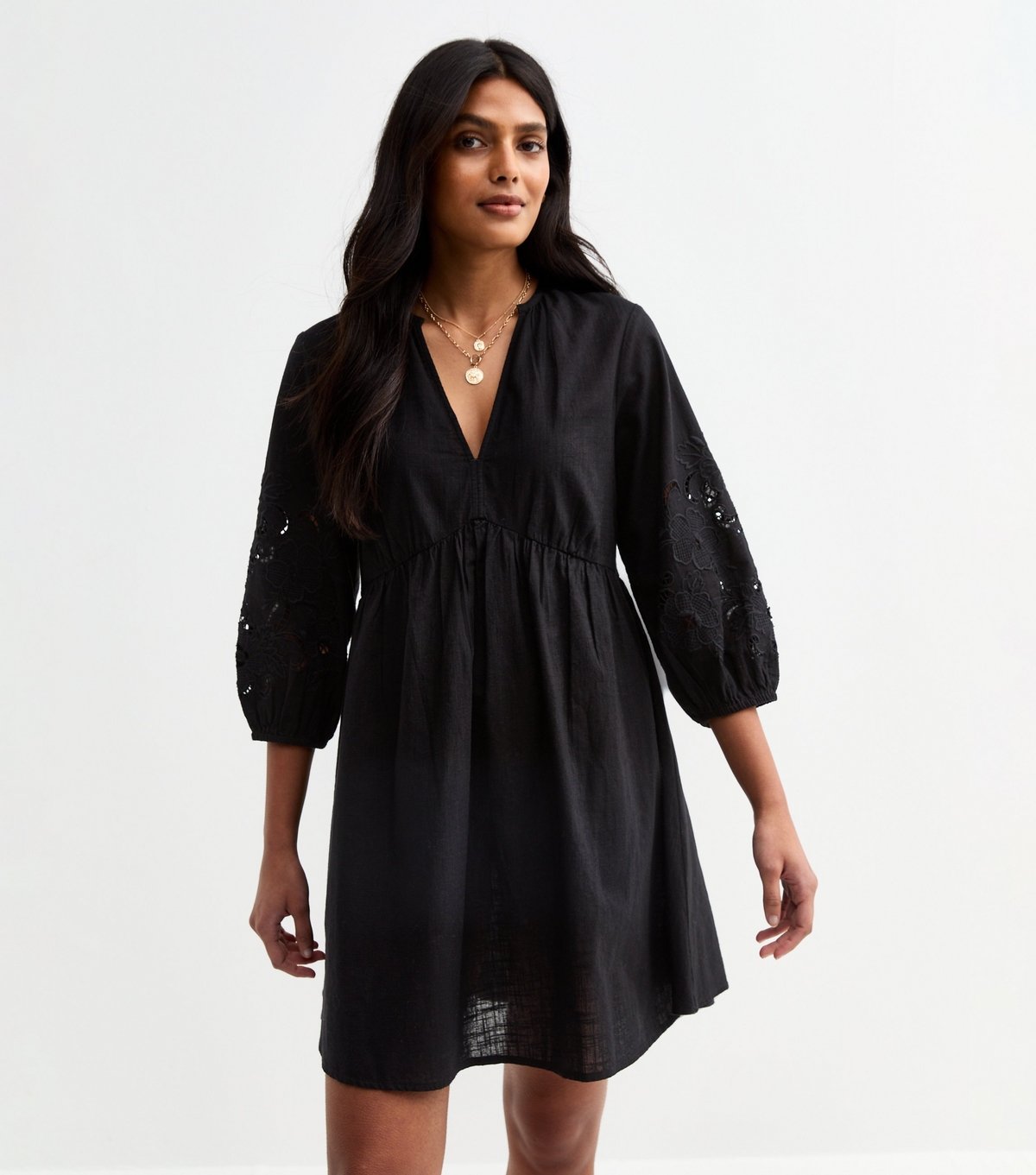 The New Look Black Broderie Sleeve Smock Mini Dress is made from cotton.