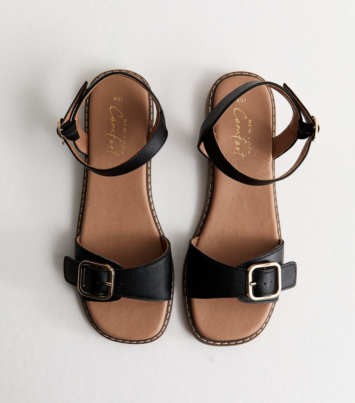 The New Look Black Faux Leather Buckled Sandals is available in sizes 3, 4, 5, 6, 7, 8, 9.