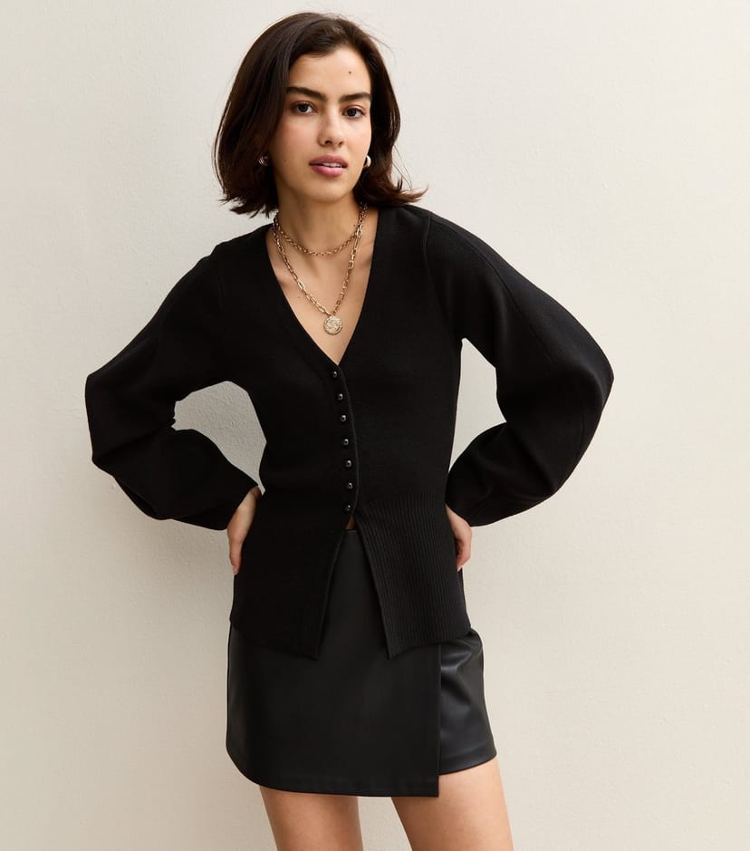 Sophisticated and sleek, this black compact knit cardigan can be layered or worn as a stylish solo piece. Featuring a V-neckline and button-up front, it echoes the angular hem for a modern touch.