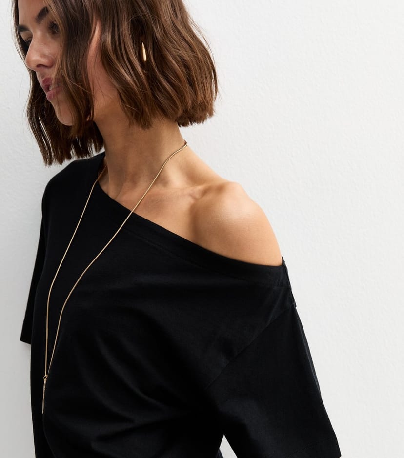This black cotton jersey off-the-shoulder T-shirt by New Look features a slouchy fit and longline length. The off-the-shoulder neckline adds a touch of elegance to this relaxed staple.