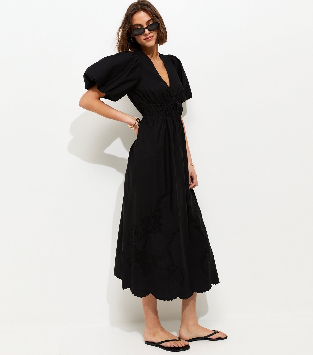 The New Look Black Cotton Puff Sleeve Midi Dress is available in sizes 10, 12, 14, 16, 18, 20, 22, 6, 8.