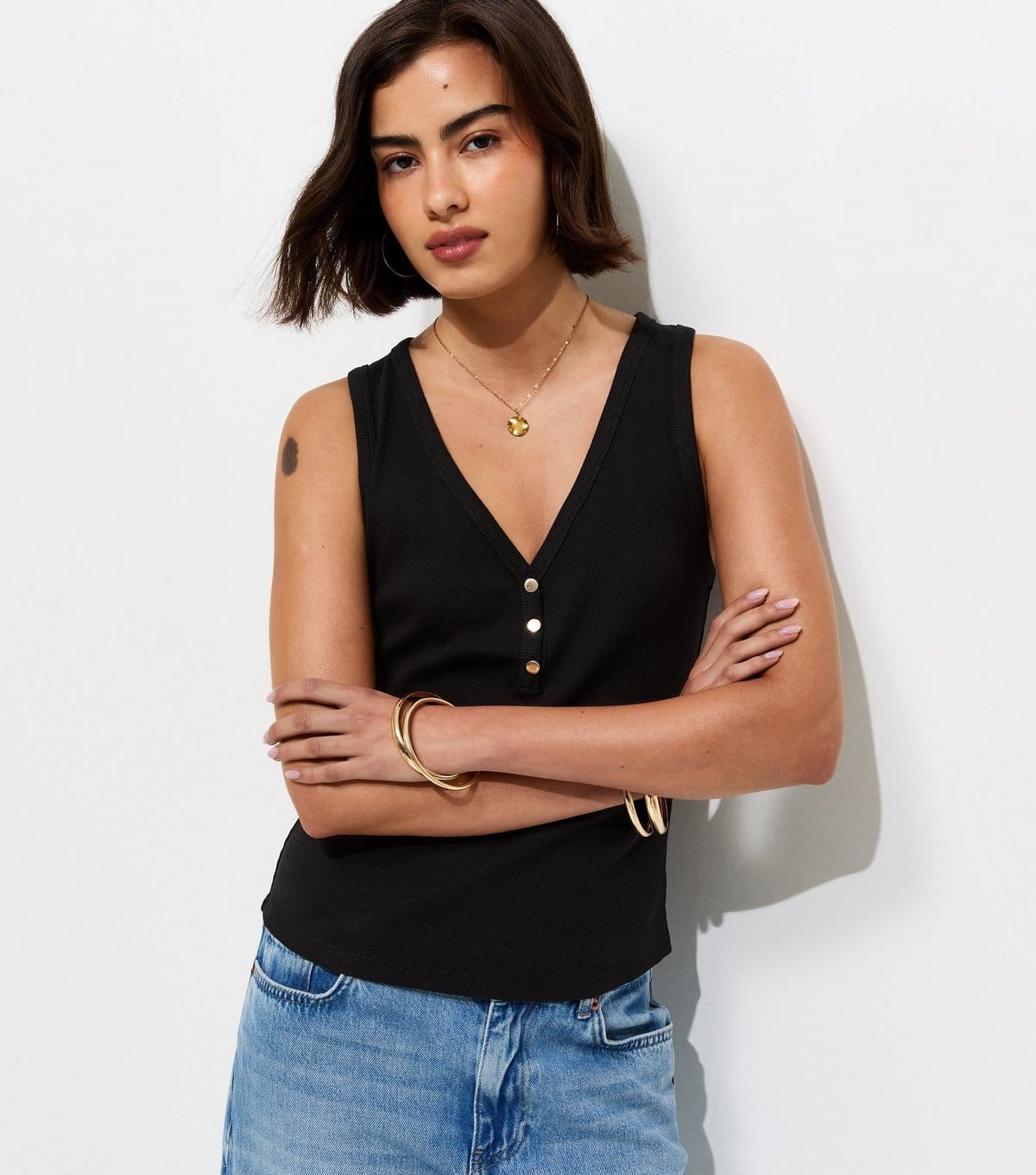 See all outfit ideasStylish black cotton-rich Henley vest top with a V-neckline and gold-tone buttons. Perfect for a casual summer look.