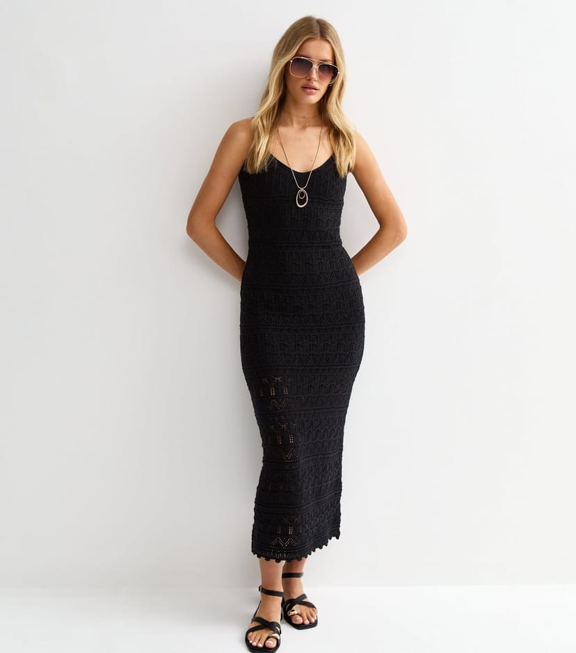 Sleek and stylish, this black open knit midi dress by New Look is perfect for summer. Featuring a V-neckline and lace-like knit pattern, it offers a figure-skimming fit and effortless elegance.