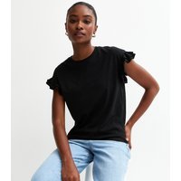 The New Look Black Cotton Slub Frill Sleeve T-Shirt is available in sizes 10, 12, 14, 16, 18, 20, 6, 8.