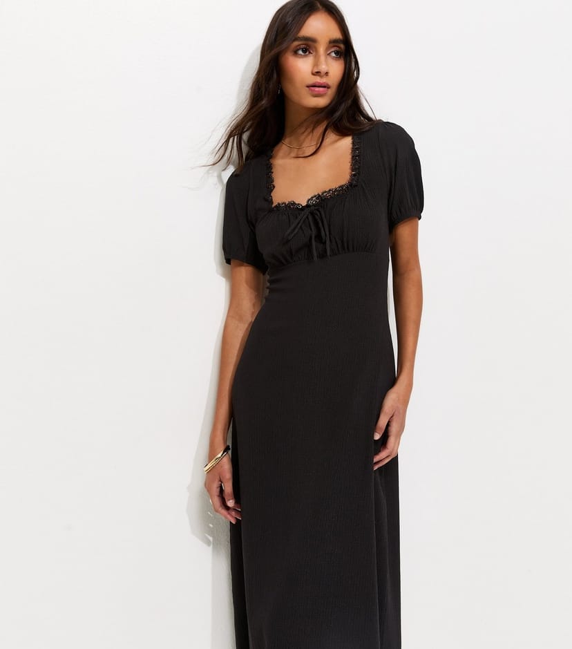 The New Look Black Crinkle Jersey Milkmaid Midi Dress is available in sizes 10, 12, 14, 16, 18, 6, 8.
