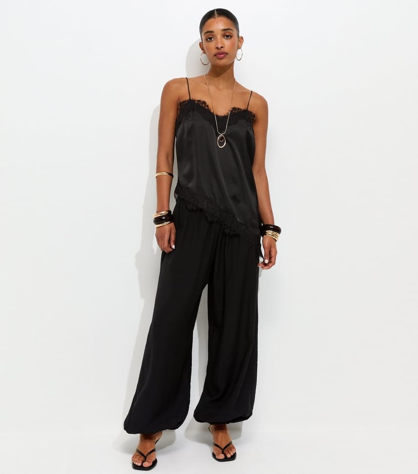 View New Look UK's returns policyTrendy wide-leg trousers in black jersey with a relaxed fit and voluminous balloon silhouette. Perfect for casual or dressed-up looks.