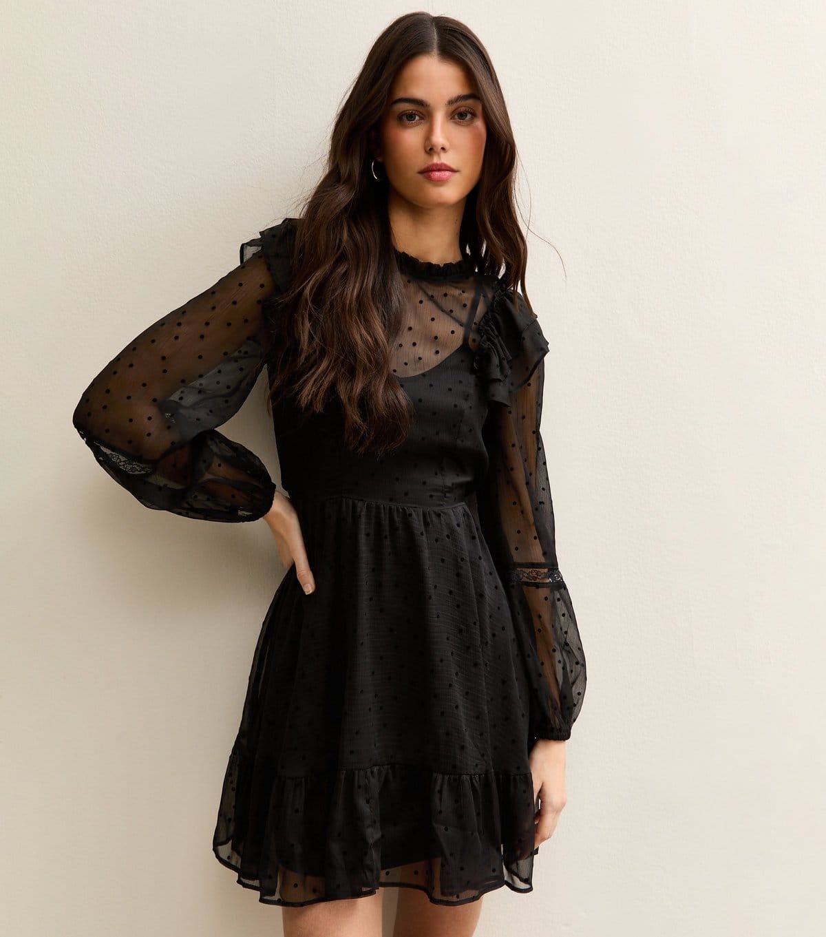 The New Look Black Dobby Ruffle Long Sleeve Mini Dress is ideal for evening, date-night, party.
