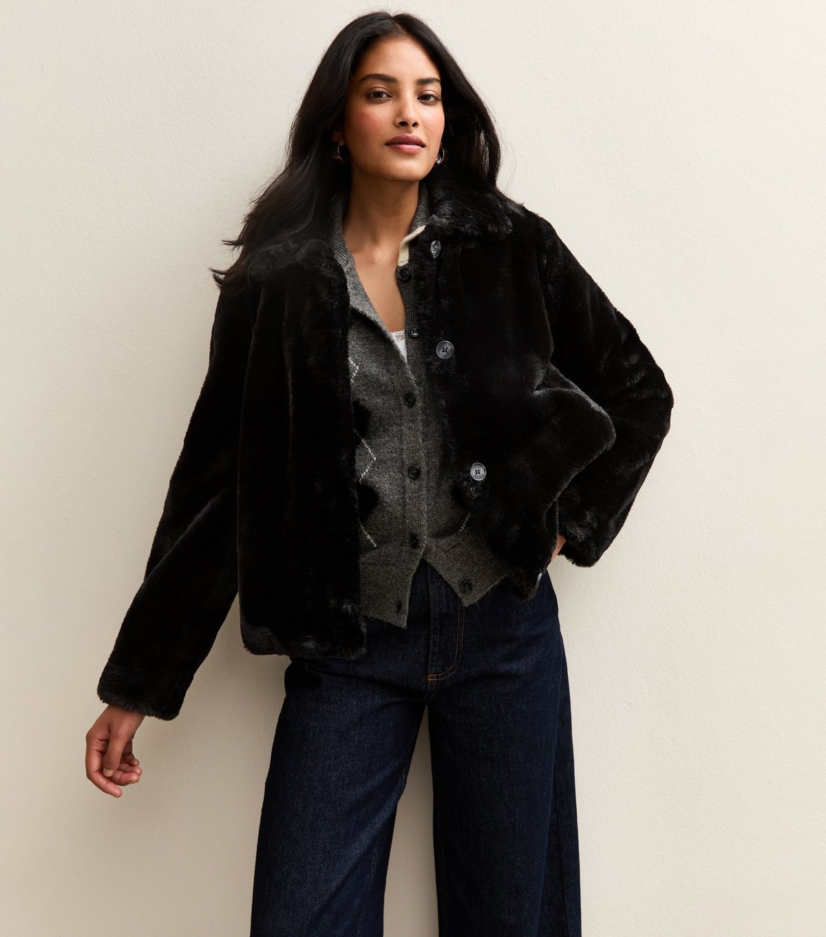 The New Look Black Faux Fur Jacket is available in sizes 20, 22, 6, 8.