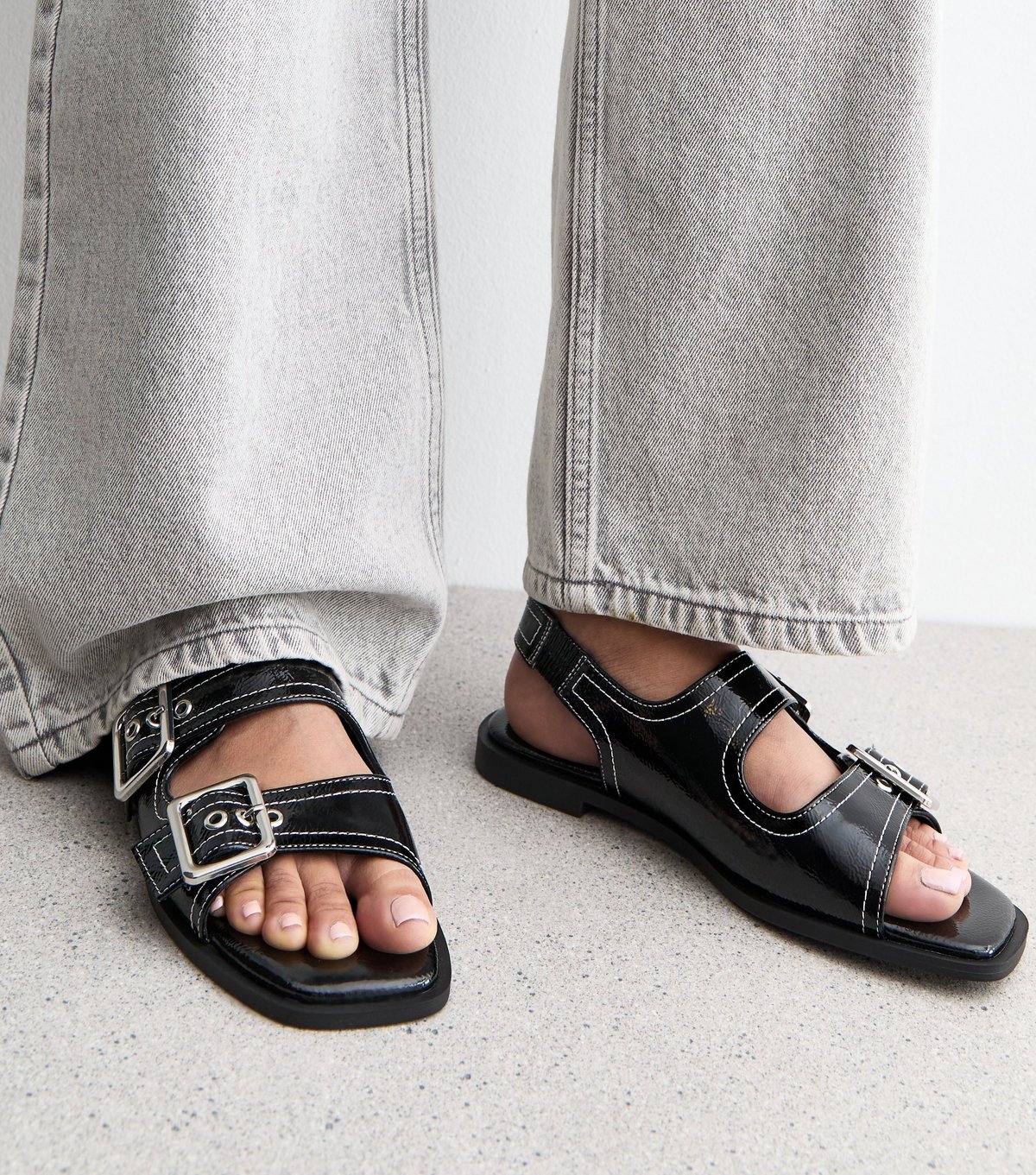 The New Look Black Faux Leather Contrast Stitch Slingback Sandals is available in sizes 3, 8, 9.