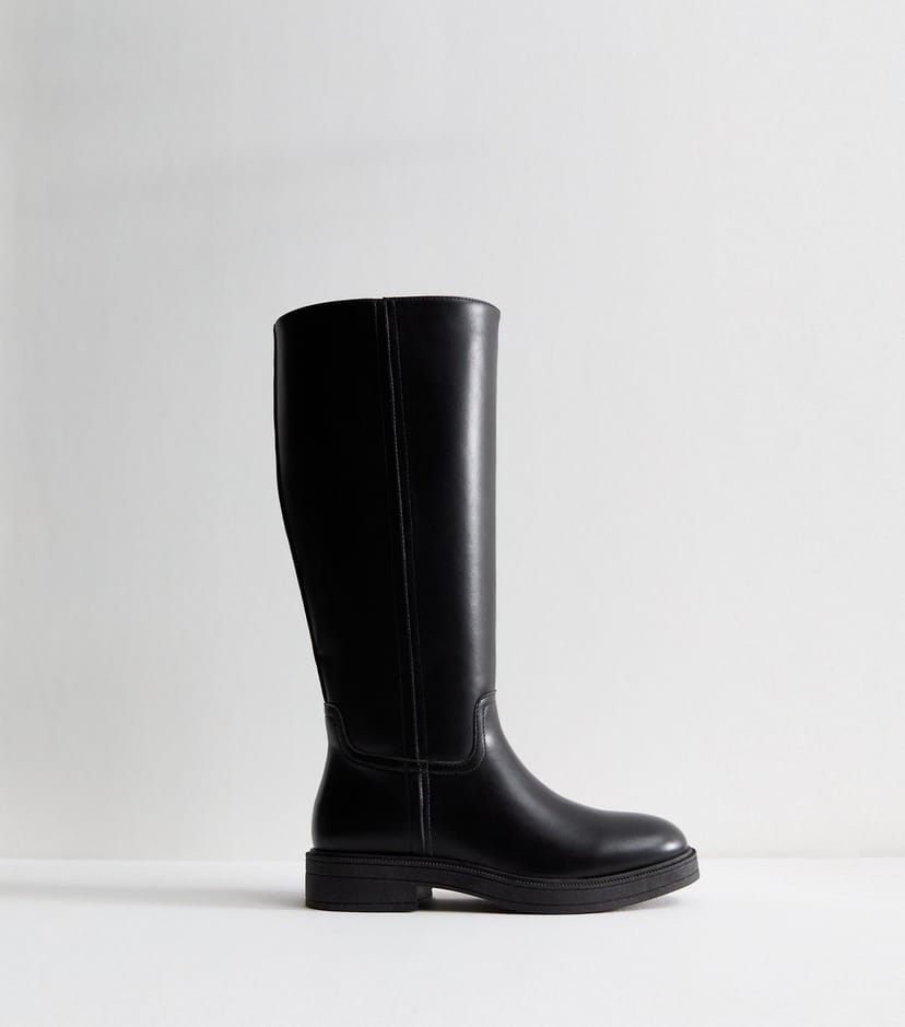 The New Look Black Faux Leather Knee High Riding Boots is available in sizes 6, 9.