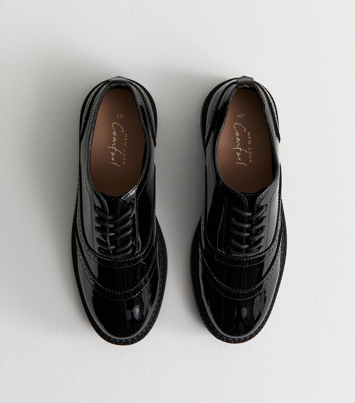 The New Look Black Faux Leather Patent Brogues is available in sizes 3, 5.