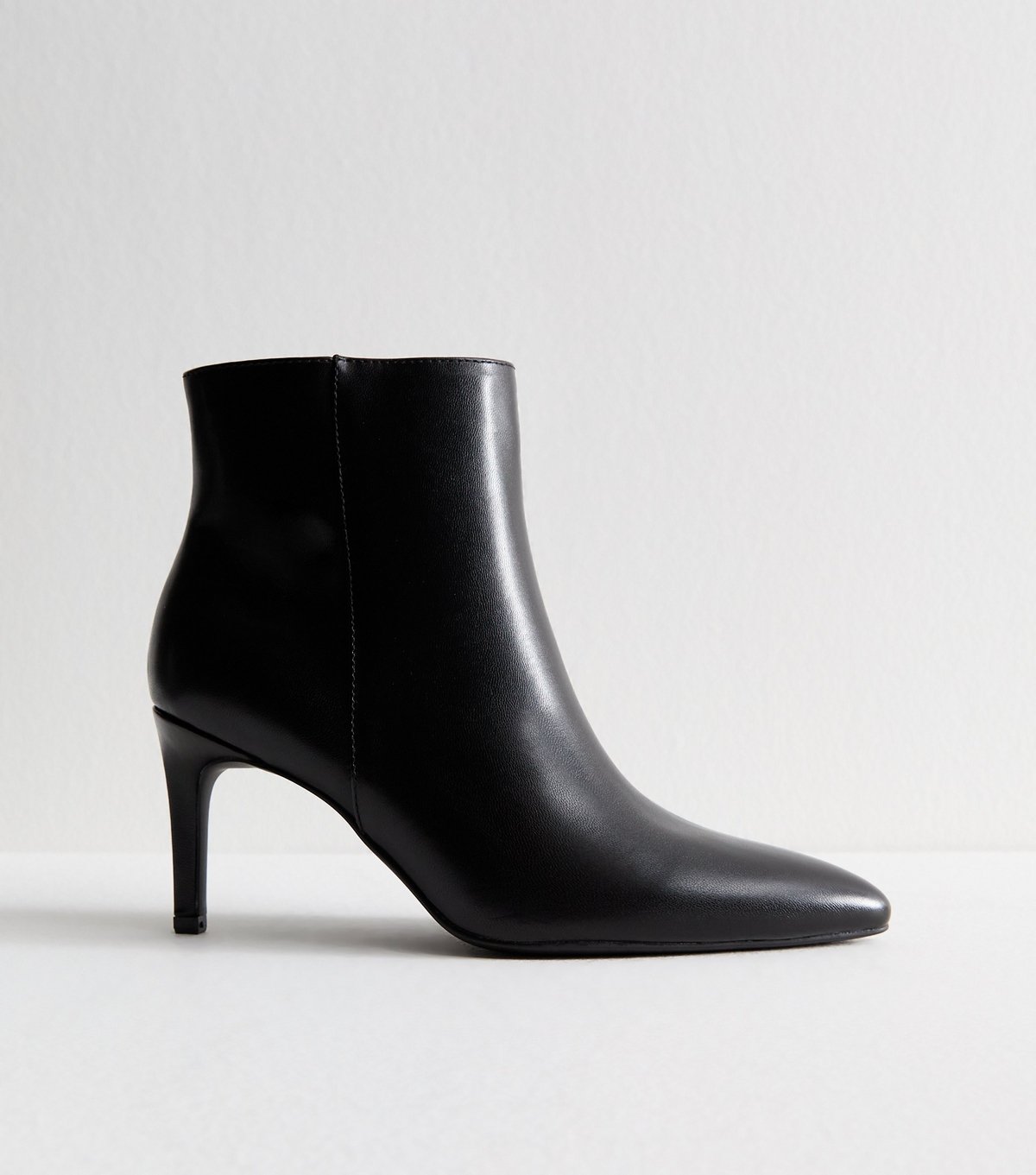Sleek black faux leather ankle boots with a pointed toe and stiletto heel. The mid-heel height and zip-up design make them versatile for both office days and evening outings.
