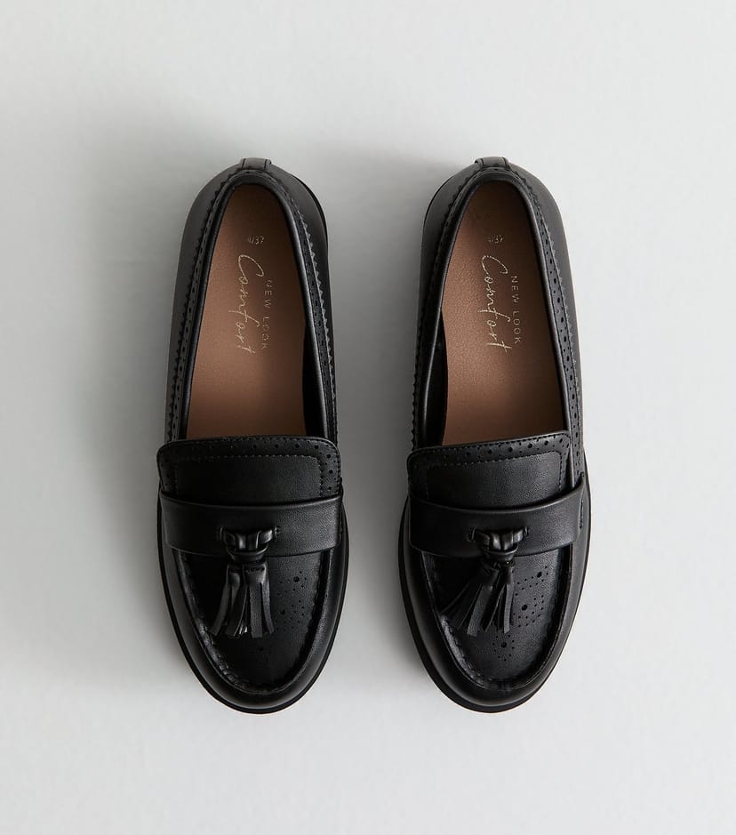 The New Look Black Faux Leather Tasselled Loafers Vegan is available in sizes 3, 4, 5, 6, 7, 8.