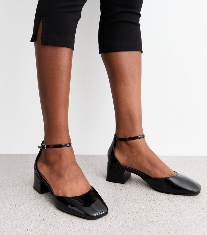 The New Look Black Faux Patent Block Heel Open Court Shoes is available in sizes 9.