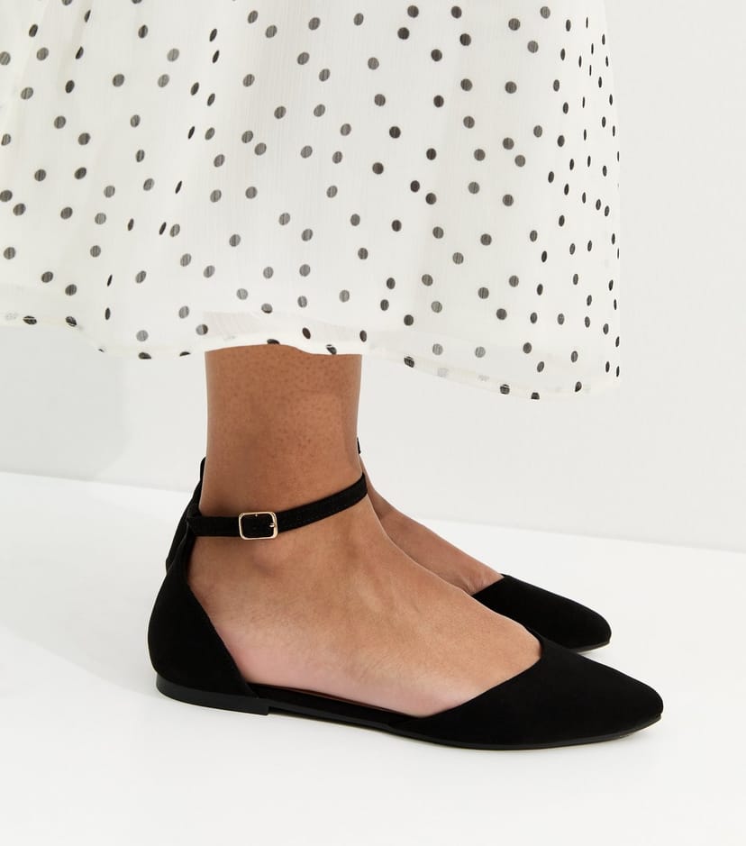 Stylish black faux suede pointed flats by New Look. Perfect for everyday wear, these flats feature a chic pointed toe and a slim buckled strap. Made with vegan materials and registered by The Vegan Society.
