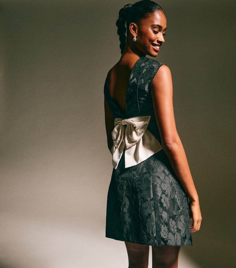 The New Look Black Floral Jacquard Bow Mini Dress is ideal for evening, party, date-night.