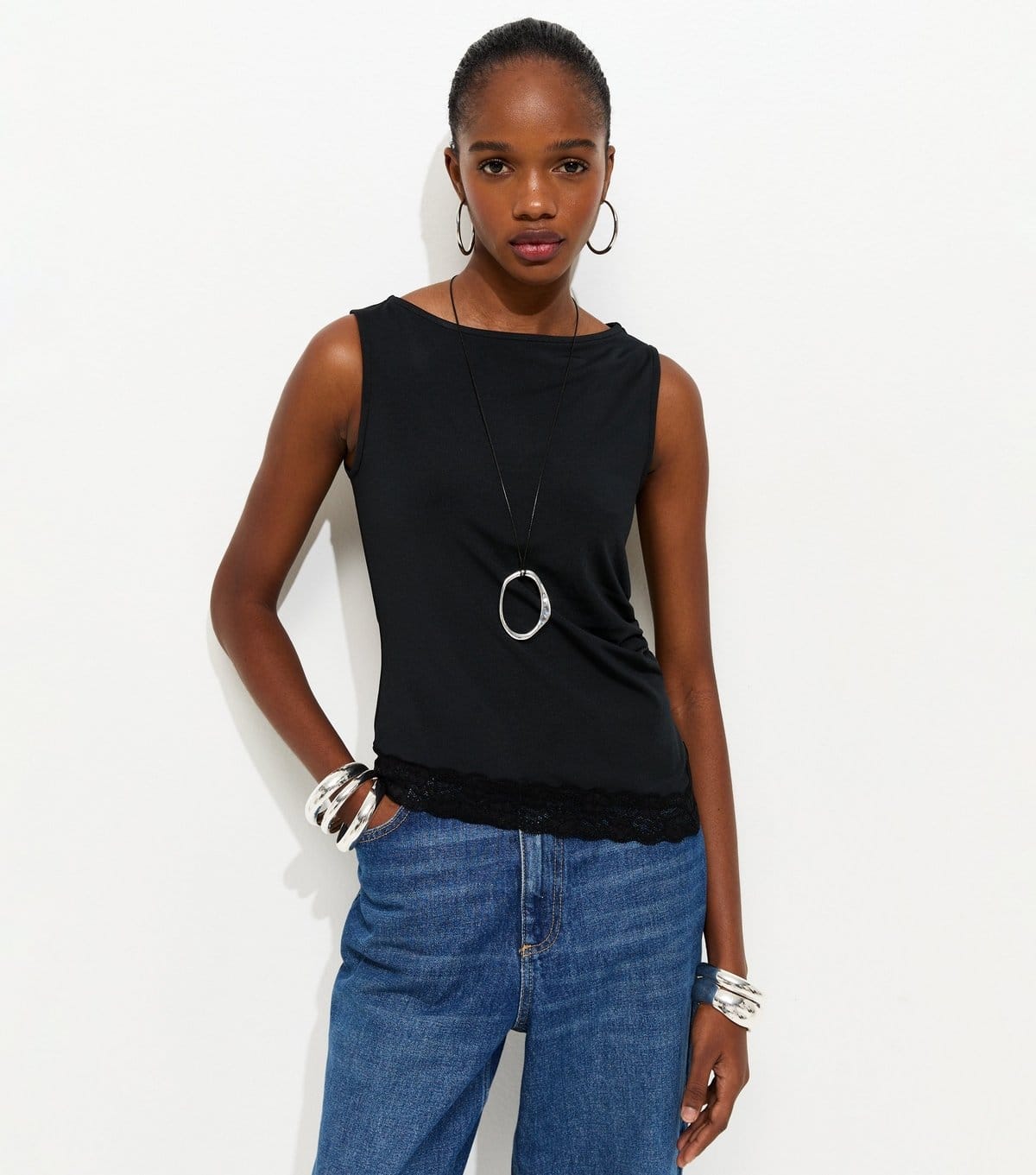 The New Look Black Jersey Lace Trim Asymmetric Hem Top is ideal for casual, everyday, summer.